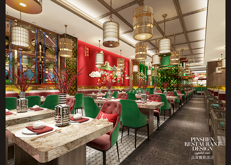 7、燈光設計:燈光對餐飲空間環境塑造起著非常重要的作用,通過燈光設計塑造出不同的氣氛。我們茶樓屬于比較熱鬧的用餐氛圍,整個空間除了餐廳的整體基礎照明外,我們對局部照明使用了具有濃郁廣式點心茶樓特性的鳥籠燈,蒸籠燈,讓照明燈具也成為了空間美學的重要部分,讓顧客印象深刻。