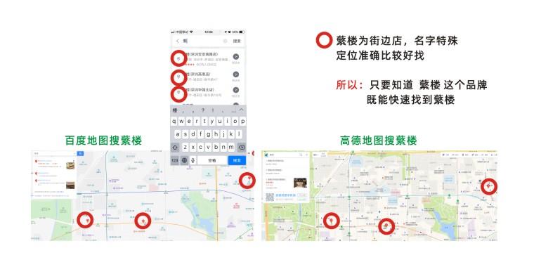 為最大化簡化且傳達信息,我們把蘩樓三個店簡化為“華強北店,福田燕南店,羅湖寶安南路”,這種門店命名原則是按照地圖搜索高頻詞及地鐵站站點來刻意命名的,一切都是為了讓顧客更方便快捷的找到我們。