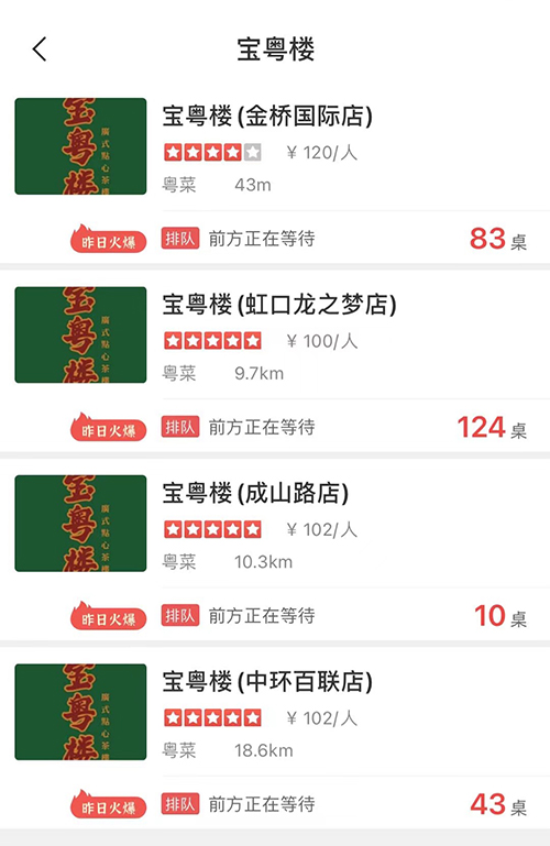 寶粵樓在2020年6月份首家店(成山路1339號大華優(yōu)嘉2樓)開業(yè)之后,品牌勢能非常強大,在不到一年的時間內,迅速開出了4家店。分別是百聯(lián)中環(huán)店(真光路1288號百聯(lián)中環(huán)購物廣場4樓)、虹口龍之夢店(西江灣路388號凱德龍之夢-A棟6樓)、金橋國際廣場店(張揚路361弄金橋國際商業(yè)廣場-7座3樓)每個店都是所在商場的排隊王,流量明星,人氣爆滿,極速成為了上海粵菜點心品類的頭部品牌。