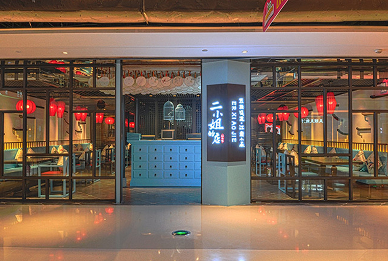 餐廳品牌形象設計,在策劃階段需明確定位,LOGO形象設計清楚表達主題,店面視覺形象上吸睛,有沖擊力。如:二小姐的店,餐廳門前是一組改良設計后的藍綠色多寶格咨詢臺,多寶格根據中式家具的中藥箱款式優化設計而來。