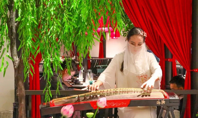 LOGO反嵌與藍色立柱內,透過玻璃墻體,置于眼前是藍色多寶格收銀臺,頭頂上是最具江南格調的團扇,藍綠色座椅搭配刺繡抱枕,清新淡雅。空中紅色燈籠,藍綠色鳥籠與座位既撞色又相互呼應。