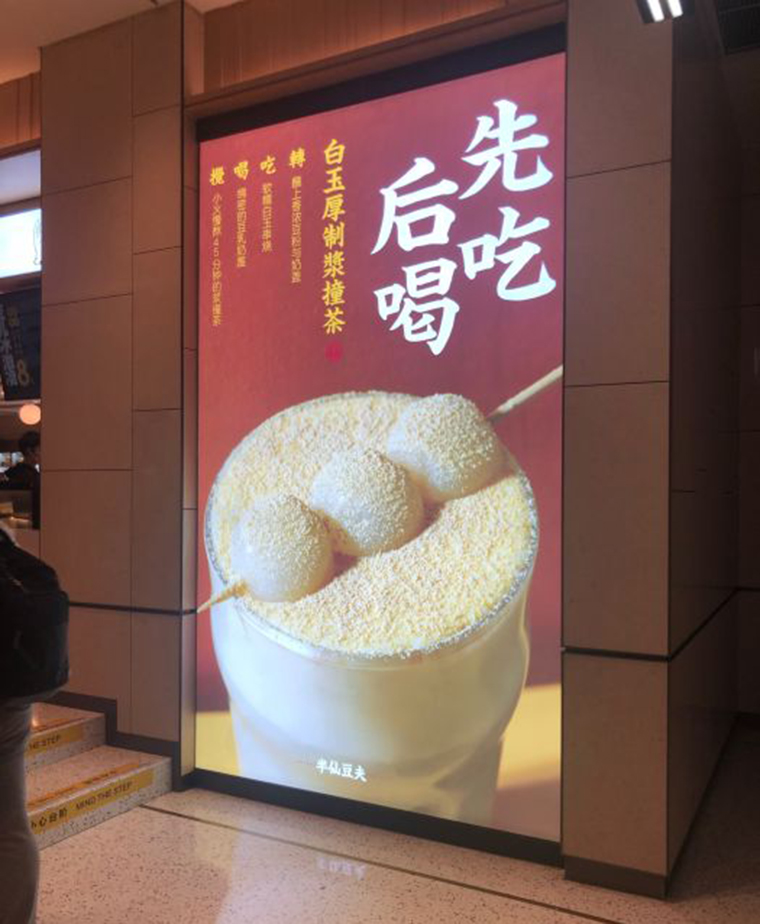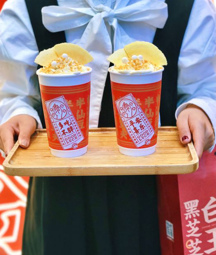 注重儀式感,豆?jié){出品前用一串日本白玉丸子橫在杯子上,并撒上豆粉,儀式感滿滿,白玉丸子蘸上香濃豆粉與奶蓋,先吃軟糯白玉串燒,再喝綿密的豆乳奶蓋,成功地把豆?jié){變成能吃的豆乳茶,引來(lái)顧客爭(zhēng)相拍照打卡,一時(shí)間成為網(wǎng)紅產(chǎn)品。