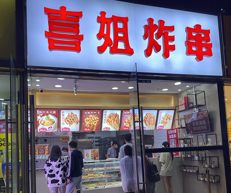 看喜姐炸串的門店裝飾裝修設(shè)計,我們來分析下喜姐炸串品牌名和門頭設(shè)計有哪些亮點,可供各位餐飲人借鑒參考。