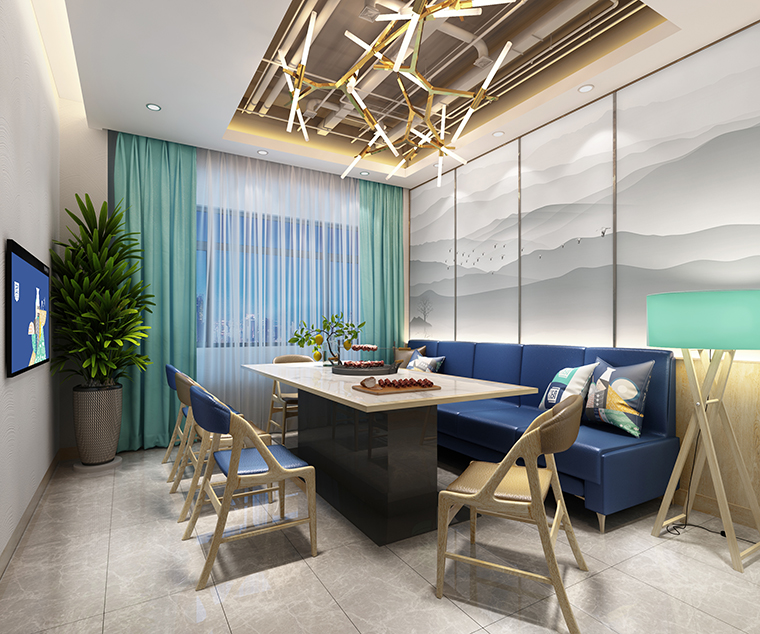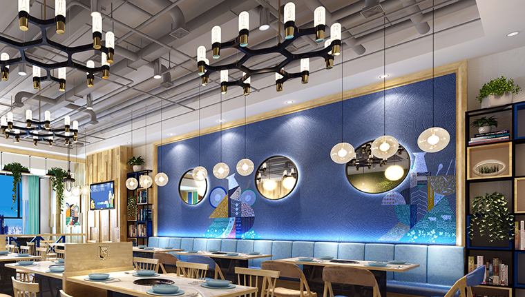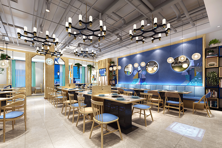 品深餐飲設(shè)計(jì)在整個(gè)空間裝飾設(shè)計(jì)中,我們貫徹“讓消費(fèi)者能放松心情,享受美食,有情懷,有情調(diào),有趣味”。通過(guò)空間中大面積天空藍(lán)的使用,與我們傳達(dá)的新鮮,干凈、現(xiàn)拌的出品特質(zhì)完美契合,使用藍(lán)色刻意營(yíng)造舒適,純凈的用餐氛圍;