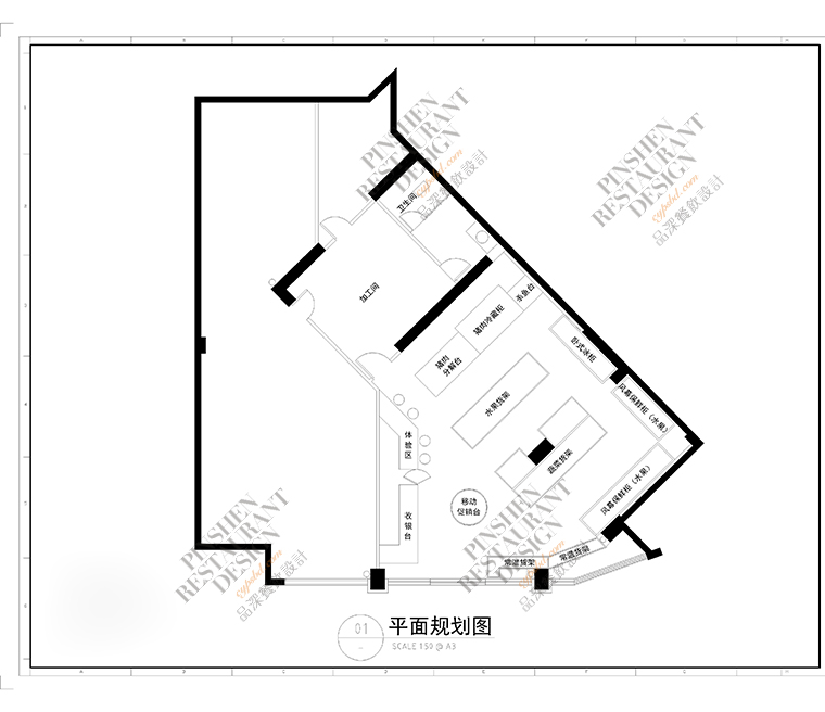 為了實現以上兩個目標,我們將功能進行合理的分區,使空間實現了最大化利用;在裝飾設計方面則以主題深綠色,搭配使用淺灰色,形成一種簡潔素雅,明快整齊的空間格調,并與其他生鮮品牌形成了明顯的區分;墻面及門框、臺面等,我們使用紋理較為細膩的木色,與空間淺灰色配合,形成一種時尚,高級的氛圍感。