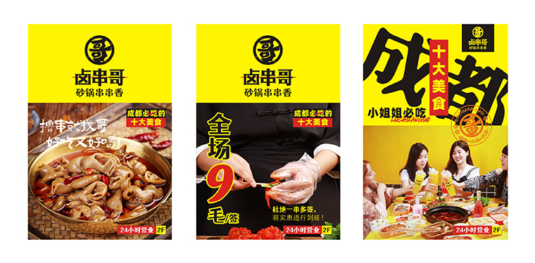 1、將門頭設計轉變成門面設計,重點投入,反復推敲,裝修經費傾斜,用力猛一些。鹵串哥坪山店的整個外立面廣告招牌,設計非常大氣,覆蓋一整面墻,讓遠遠的顧客都能看見,門面上顧客可看見的地方不斷重復強調品牌核心訴求,如24小時營業,地道成都砂鍋串串香,小姐姐必吃成都十大美食,9毛一簽等,讓門面成立吸引消費者進店的大利器。